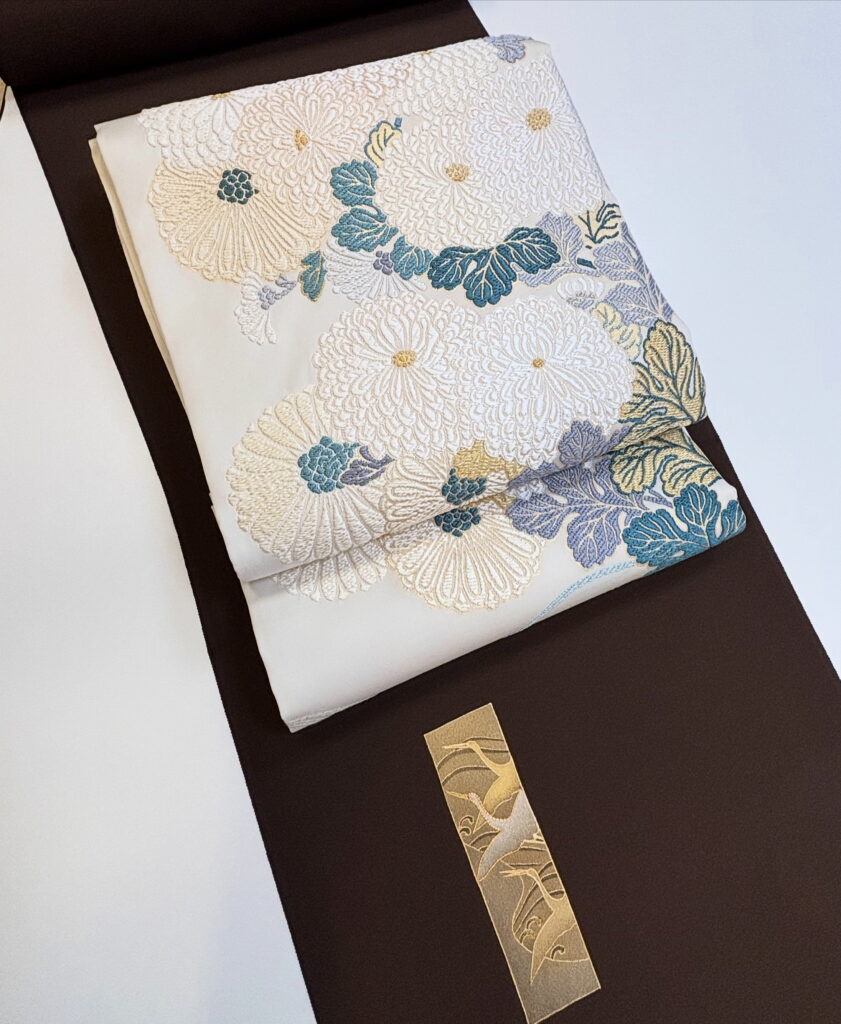 ![]() 焦げ茶地 金彩琳派模様 付下げ 白地 菊花文 袋帯 |